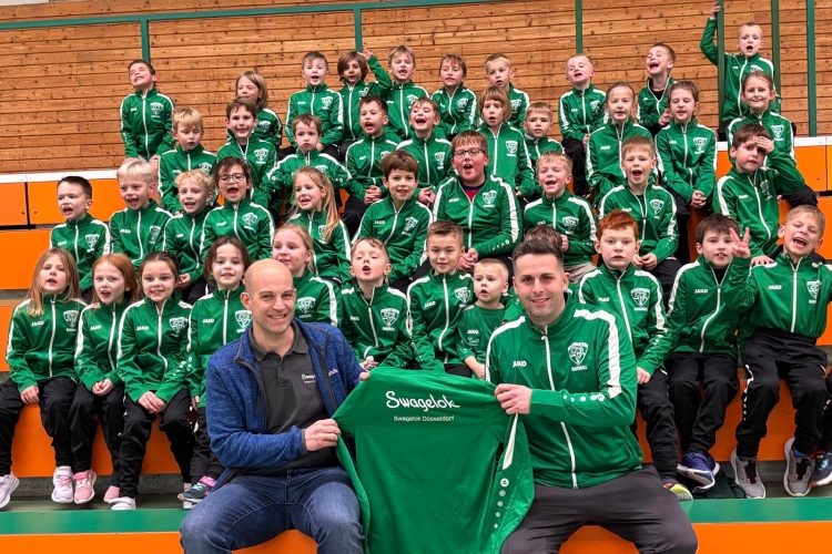 An dieser Stelle möchten wir uns herzlich bei unserem Sponsor „Swagelok Düsseldorf“ bedanken. Geschäftsführer Kai Jakobs ließ es sich nicht nehmen, die 55 Trainingsanzüge für unsere Kinder und Trainer persönlich an unseren Cheftrainer Steven Christ zu überreichen.